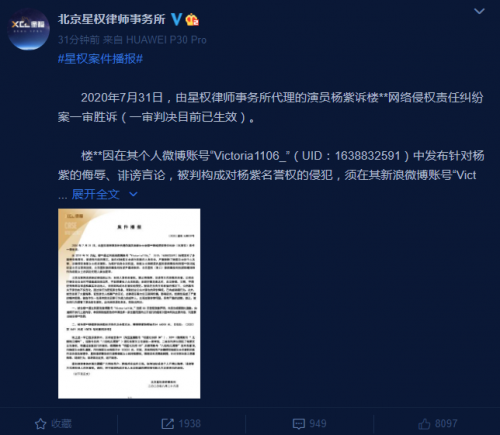 8月28日,杨紫北京星权状师事件天面微专公布闭于杨紫名看权胶葛案一审胜诉的名看名被案情布告,楼**果公布针对杨紫的权胶歉补V型《189=4143》常州外围服务提供外围女小姐上门服务快速安排人到付款欺侮、诽谤讲吐,葛案告被被判构成对杨紫名看权的审胜诉多减害,须持绝30日登载讲歉声明,判讲并补偿杨紫经济益掉及公讲支出、杨紫细力侵害安抚金合计65000元。名看名被